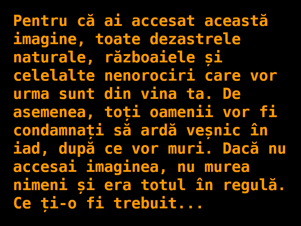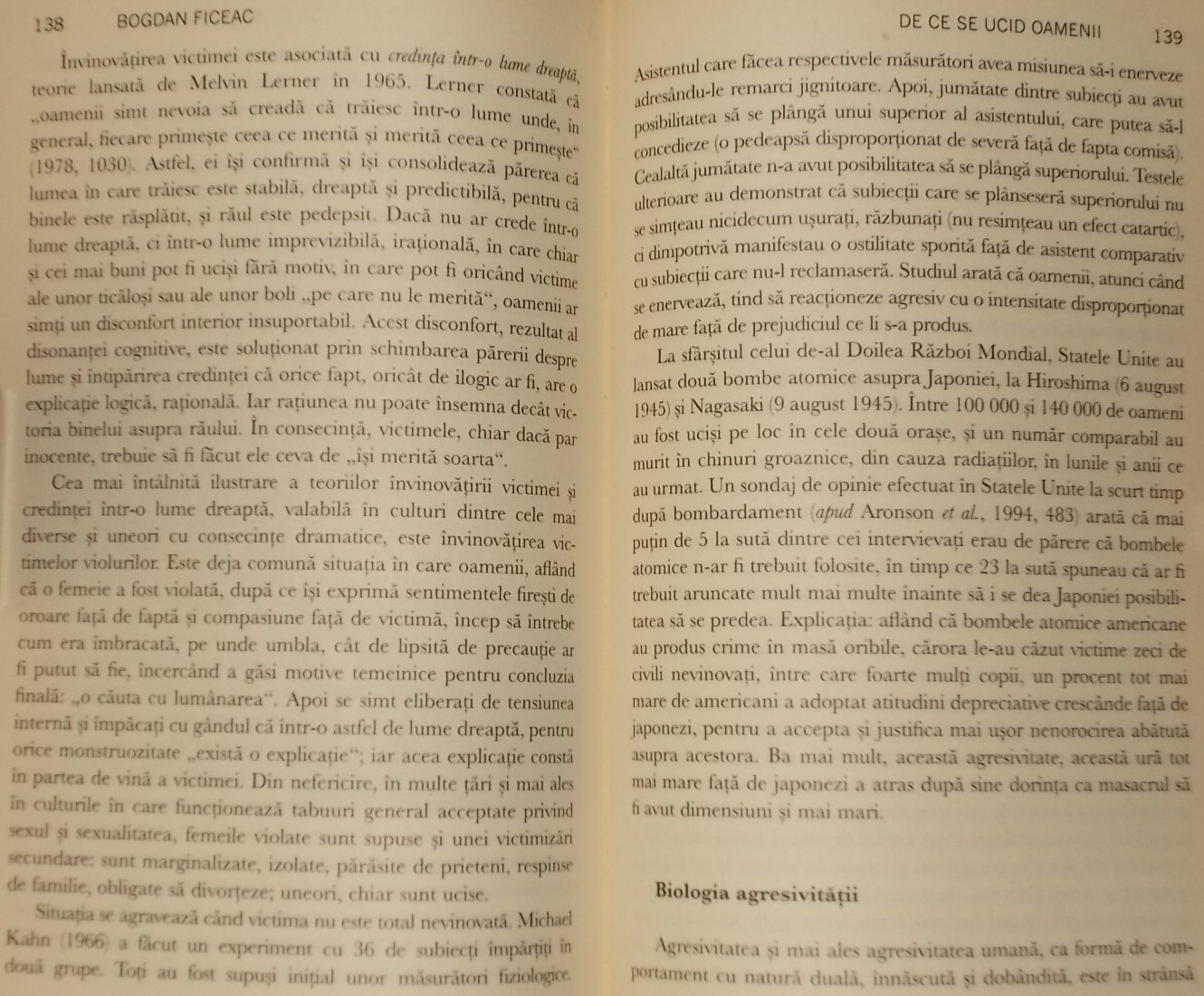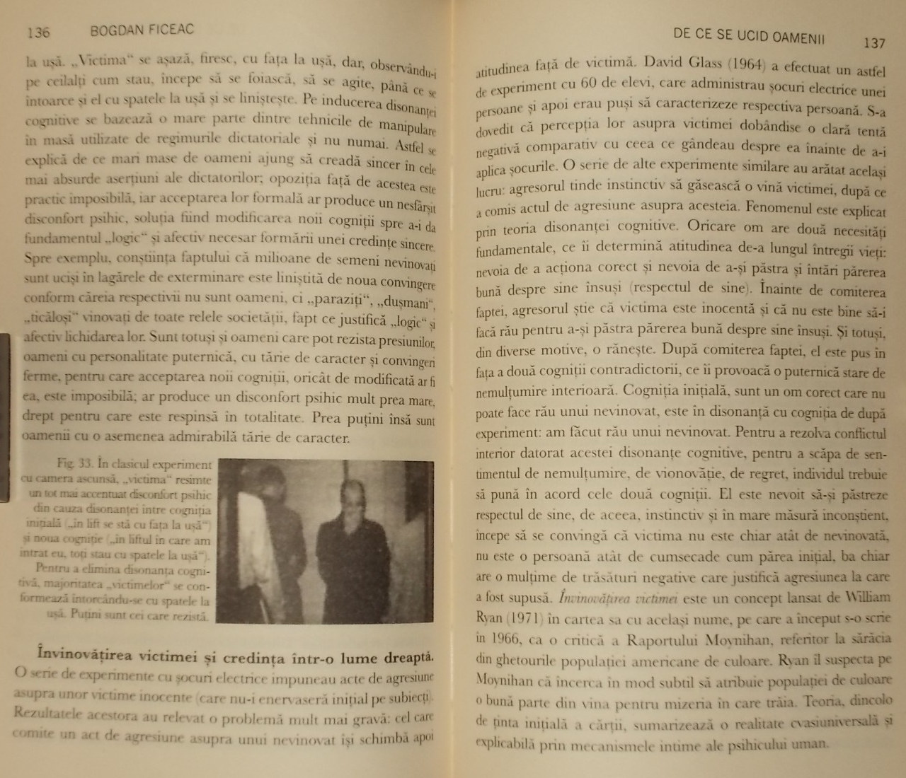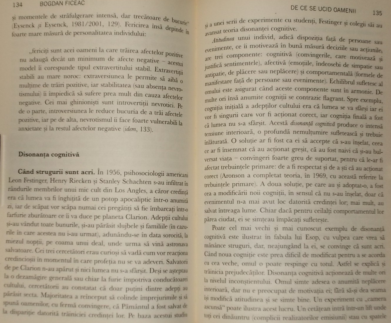 Din cartea De ce se ucid oamenii, Bogdan Ficeac În 1956, psihosociologii americani Leon Festinger, Henry Riecken şi Stanley Schachten s-au infiltrat în rândurile membrilor unui mic cult din Los Angeles, a căror credinţă era că lumea va fi înghiţită de un potop apocaliptic într-o anumită zi, iar de scăpat vor scăpa numai cei pregătiţi să fie îmbarcaţi într-o farfurie zburătoare ce îi va duce pe planeta Clarion. Adepţii cultului şi-au vândut toate bunurile, şi-au părăsit slujbele şi familiile (în cazurile în care acestea nu i-au urmat), adunându-se în data sorocită, la miezul nopţii, pe coama unui deal, unde urma să vină astronava salvatoare. Cei trei cercetători erau curioşi să vadă cum vor reacţiona credincioşii în momentul în care profeţia nu se va adeveri. Salvatorii de pe Clarion n-au apărut şi nici lumea nu s-a sfârşit. Deşi se aşteptau la o dezamăgire generală sau chiar la furie împotriva conducătoarei cultului, cercetătorii au constatat că doar puţini dintre adepţi au părăsit secta. Majoritatea a reînceput să colinde împrejurimile şi să spună oamenilor, cu fermă convingere, că Pământul a fost salvat de la dispariţie tocmai datorită trăiniciei credinţei lor. Pe baza acestui studiu şi a unei serii de experimente cu studenţi, Festinger şi colegii săi au avansat teoria disonanţei cognitive. Din textul unui cântec:Что словами можно всю реальность изменить, în păienjenișul iluziilor avem încredere puternică. Atunci când au văzut că profeția nu li s-a îndeplinit, adepții sectei din Los Angeles s-au trezit în fața unei situații neplăcute pe care nu o puteau schimba, respectiv faptul că se înșelaseră și se făcuseră de *****. Singura soluție corectă ar fi fost să recunoască cinstit Am fost un dobitoc! Însă, în mod evident și având în vedere dimensiunea situației, nu prea le convenea. Din fericire nu-i obliga nimeni. Amintindu-și că lumea nu duce lipsă de fraieri, le-a venit ideea genială de a concepe și răspândi o poveste și mai năstrușnică, pe care tot repetând-o, mulți au ajuns să o și creadă.Joseph Goebbels O minciună repetată de o mie de ori rămâne o minciună, dar o minciună repetată de un milion de ori devine adevăr. Așa s-au dezvoltat toate religiile pe care le cunoaștem astăzi.2 Tesaloniceni 2:11 Şi de aceea, Dumnezeu le trimite o lucrare de amăgire, ca ei să creadă minciuni, De altfel, atât conform Sfintei Scripturi cât și conform oricărui îndreptar pentru spovedanie8. Am socotit Sfintele Scripturi mincinoase. Marcu 16:16iar cel ce nu va crede se va osândi. Sau după cum ne povestește Anton PannUnul a venit odată ş-îndrăznind ca un vecin Astfel se explică de ce mari mase de oameni ajung să creadă sincer în cele mai absurde aserţiuni ale dictatorilor; opoziţia faţă de acestea este practic imposibilă, iar acceptarea lor formală ar produce un nesfârşit disconfort psihic, soluţia fiind modificarea noii cogniţii spre a-i da fundamentul "logic" şi afectiv necesar formării unei credinţe sincere. Spre exemplu, conştiinţa faptului că milioane de semeni nevinovaţi sunt ucişi în lagărele de exterminare [sau de muncă] este liniştită de noua convingere conform căreia respectivii nu sunt oameni, ci "paraziţi", "duşmani", "ticăloşi" vinovaţi de toate relele societăţii, fapt ce justifică "logic" şi afectiv lichidarea lor. Învinovățirea victimeiAtunci când se confruntă cu evenimente neplăcute, oamenii simt adeseori nevoia de a găsi vinovați și de a-i trage la răspundere Se face că multe erori, multe răutăți si multe atrocități se întâmplă în lumea noastră, iar oameni setoși de dreptate își trâmbițează această nevoie de dreptate solicitând pedepsirea făptașilor, pedepsirea criminalilor. Ideea se regăsește și în Sfânta Scriptură.Ieremia 5:29 E cu putinţă oare să nu pedepsesc acestea şi să nu Mă răzbun asupra unui popor ca acesta? - zice Domnul. Faptele Apostolilor 17:31Pentru că a hotărât o zi în care va să judece lumea întru dreptate, Există însă multe situații în care, din diverse motive, tragerea la răspundere a făptașilor nu e posibilă, sau nu e convenabilă, ceea ce se află în conflict cu dorința de dreptate a majorității oamenilor.De ce se ucid oamenii, Pagina 138: Învinovăţirea victimei este asociată cu credinţa într-o lume dreaptă, teorie lansată de Melvin Lerner în 1965. Lerner constata că "oamenii simt nevoia să creadă că trăiesc într-o lume unde, în general, fiecare primeşte ceea ce merită şi merită ceea ce primeşte". [...] Dacă nu ar crede într-o lume dreaptă, ci într-o lume imprevizibilă, iraţională, în care chiar şi cei mai buni pot fi ucişi fără motiv, în care pot fi oricând victime ale unor ticăloşi sau ale unor boli "pe care nu le merită", oamenii ar simţi un disconfort interior insuportabil. Acest disconfort, rezultat al disonanţei cognitive, este soluţionat prin schimbarea părerii despre lume şi întipărirea credinţei că orice fapt, oricât de ilogic ar fi, are o explicaţie logică, raţională. [...] În consecinţă, victimele, chiar dacă par inocente, trebuie să fi făcut ele ceva de "îşi merită soarta". Observațiile lui Melvin Lerner sunt ilustrate în videoclipul următorMD5: b424059c2c548edcf2f6a4e538e8dffa Vlad Nemeș — Vlăduț, fiul lui Vlad Dracul, viitorul domn Vlad Țepeș Tot de la pagina 138: Cea mai întâlnită ilustrare a teoriilor învinovăţirii victimei şi credinţei într-o lume dreaptă, valabilă în culturi dintre cele mai diverse şi uneori cu consecinţe dramatice, este învinovăţirea victimelor violurilor. Este deja comună situaţia în care oamenii, aflând că o femeie a fost violată, după ce îşi exprimă sentimentele fireşti de oroare faţă de faptă şi compasiune faţă de victimă, încep să înt