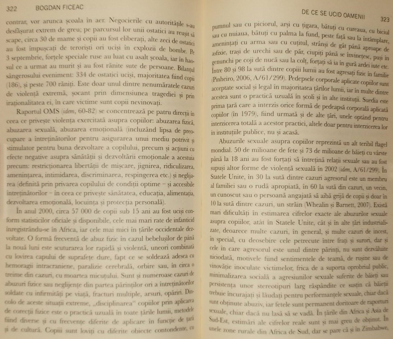 ereditară către rău. Dacă în familie, cât ai copilul acasă în cei şapte ani, nu te-ai grijit să-l înveţi rugăciuni, să facă cruce, să ştie Tatăl nostru, Crezul, să-l duci la biserică, să ştie ce înseamnă post, să ştie ce înseamnă păcat, să se ferească de păcat, atunci cresc nişte bestii, nişte fiare. Cum stau de fapt treburile cu religia creștină ne explică Iuri Oleșa, în cartea Trei grăsani (alt).MD5: 67a6281164418e1a27286e086ff7b41f Pagina 178, traducere: Atunci cei Trei Grăsani mi-au zis: "Scoate inima băiatului și fă-i în locul ei o inimă de fier". Dar am refuzat. Am spus că o ființă umană nu poate fi lipsită de inima sa umană, am zis că nici o inimă, nici de fier, nici de gheață, nici de aur, nu poate fi dată unei persoane în locul inimii sale reale, umane. Am fost pus într-o cușcă și din acea zi au început să-i spună băiatului că are o inimă de fier. Au vrut ca el să creadă asta și să fie crud și răutăcios. Există și câteva studii Copiii vin pe lume înzestrați cu bogate și extinse tendințe pro-sociale și, după câte se pare, sunt predispuși să le pese de ceilalți oameni. [...] Potrivit celor mai recente cercetări în domeniu, bebelușii îi ajută pe ceilalți în mod instinctiv, încercând să le aline suferința cu prețul propriului confort, neliniștindu-se dacă "opera de artă" construită în timul jocului de un alt copil este distrusă și împărțind recompensele pentru o sarcină pe care au avut-o în comun, În caz că nu s-a înțeles, așa-zisa predispoziție către rău a copiilor e de fapt efectul comportamentului abuziv al adulților. Mai multe explicații se găsesc în capitolul următor precum și în prima pagină.Despre dictatori și alte observații De ce se ucid oamenii, paginile 118-119: O serie întreagă de dictatori din istoria omenirii au avut copilării lipsite
